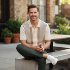 This men's polo shirt is crafted from breathable viscose fabric with a sophisticated knit construction for superior comfort. The design features a classic retro aesthetic with vertical stripes, a traditional collar, and a functional button-down front. Designed with a loose fit and short sleeves, this versatile top offers a refined yet casual look suitable for leisure activities and social settings.